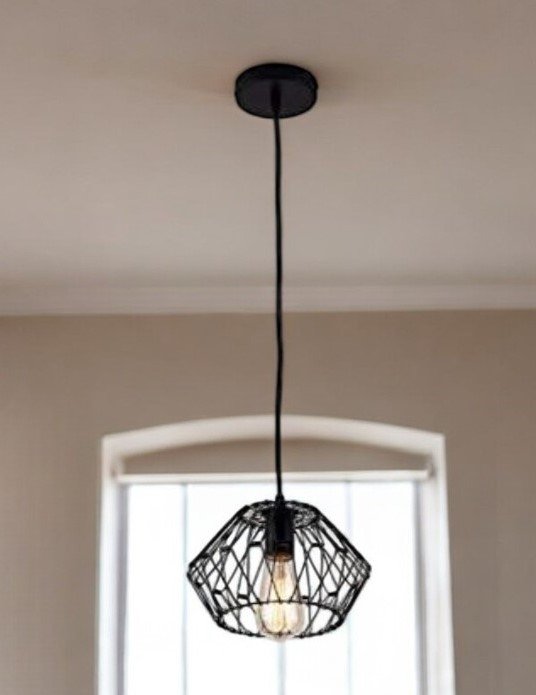 This beautiful black metal cage modern industrial single bulb hanging pendent light will brighten up and change the look of your room. With its black geometric metal cage like shape, this hanging light gives off a modern and updated vibe. Get creative and change up the look of any room from Hallway, to Closet, to Office or Bedroom with this gorgeous hanging chandelier light fixture. Compatible with several different style of bulbs, so you can change up the look as you desire. 13" H x 3" W x 12" D