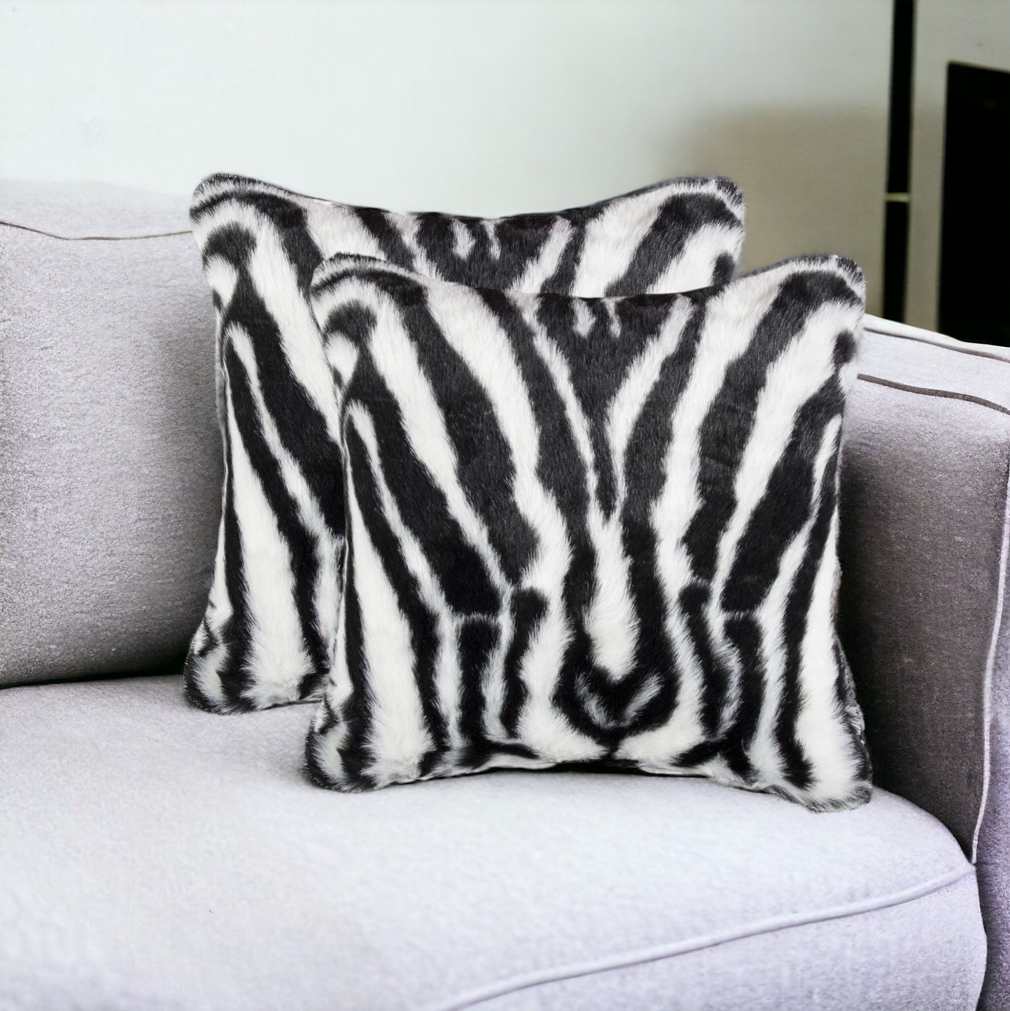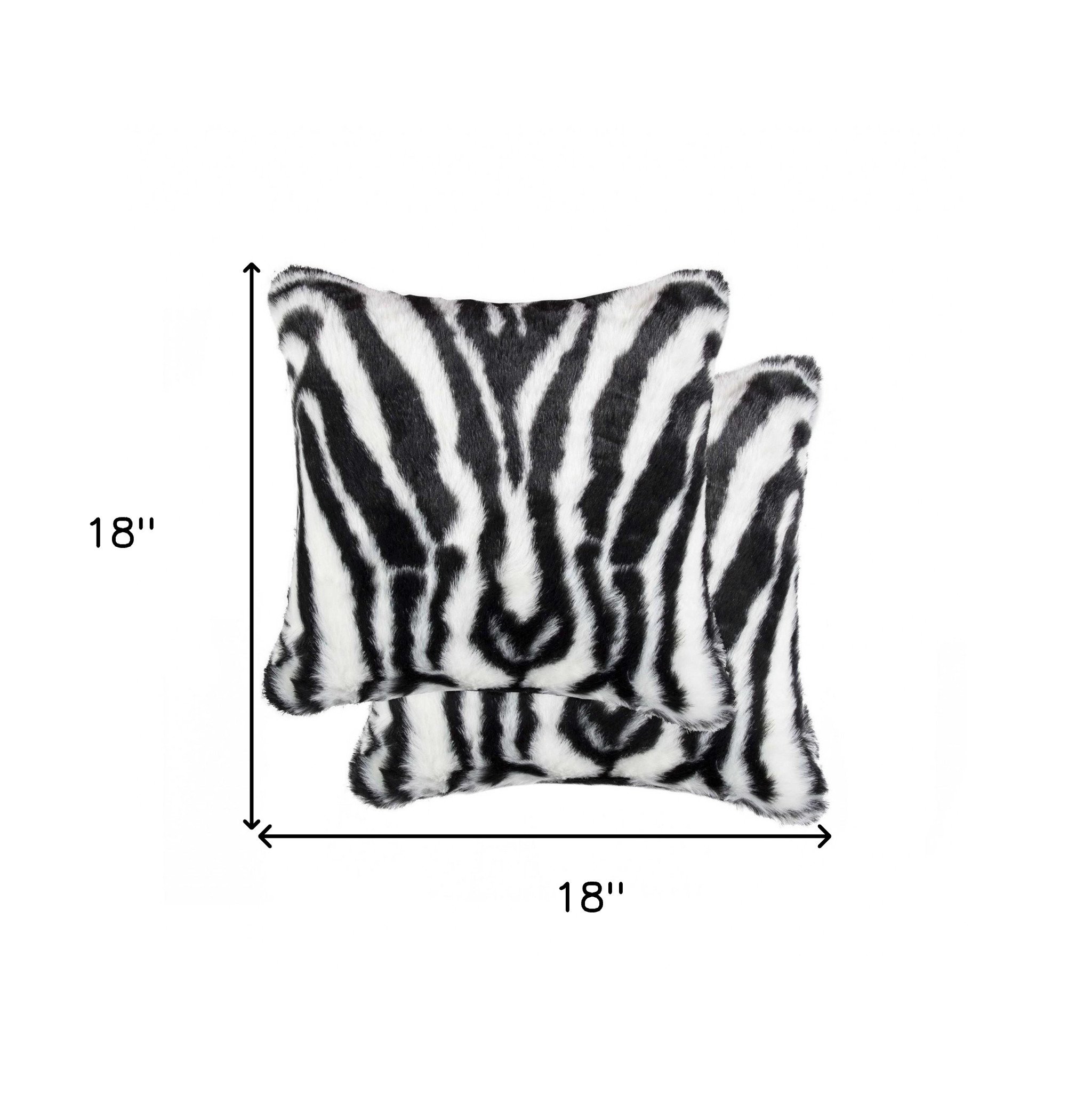 The set of two 18-inch black and white faux fur throw pillow is the perfect decorative accessory for your home. These black and white hued pillows represent quality construction, expertly made from high grade faux fur that is fluffy and soft. Super soft and built to hold its shape, this cotton pillow is a great option. Great to use on its own or mix with other decorations for the perfect look. A great decorative accessory for your favorite chair, to accent your sofa, or to use as part of your bed ensemble. 18-inch H x 18-inch W x 5-inch D