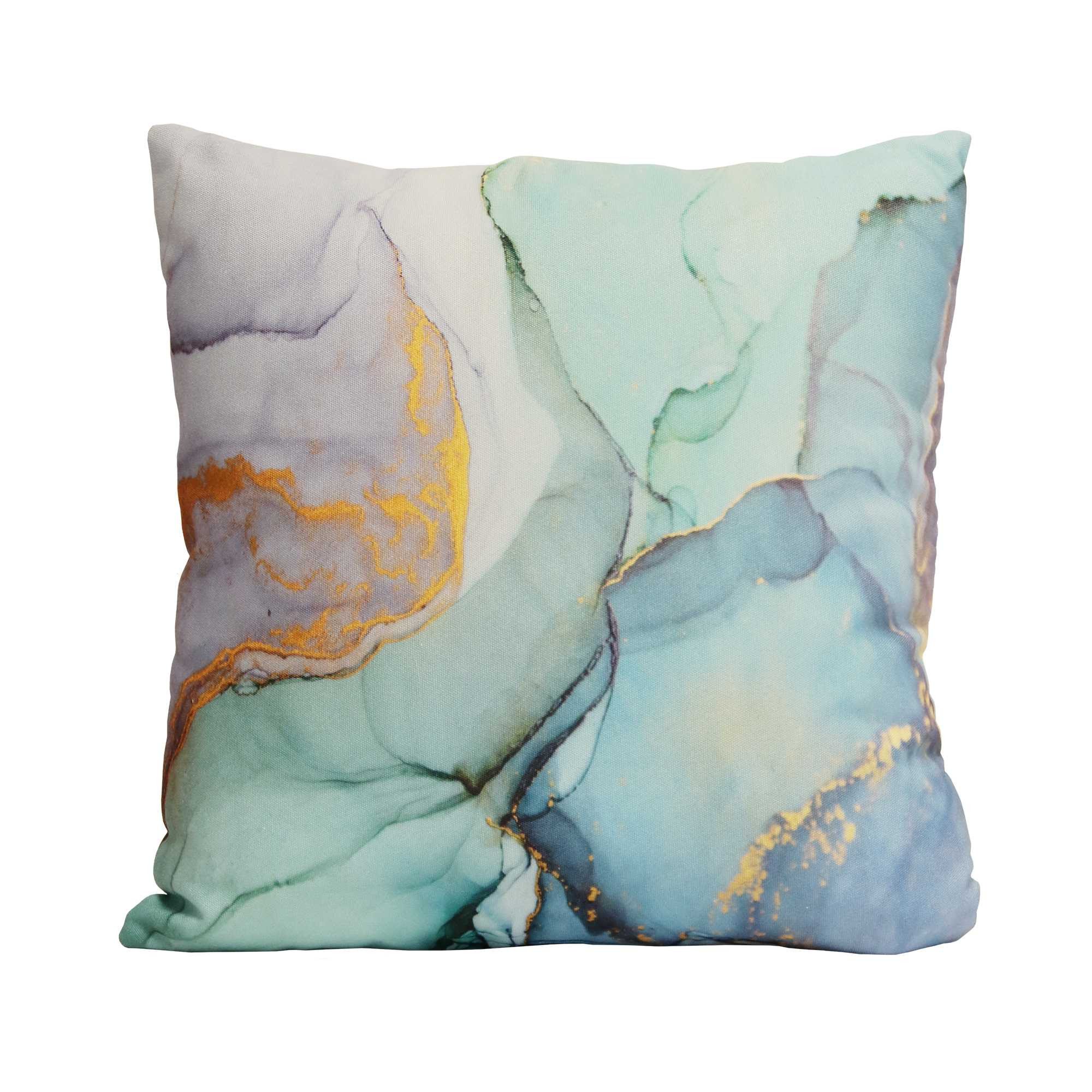 The perfect complement to your sofa, favorite chair, or bed, this 18-inch blue and green marble cotton throw pillow is a great decorative accent. This soft and durable decorative pillow is expertly made of high grade, long lasting cotton in a blue and green coloration. Super soft and built to hold its shape, this polyester pillow is a great option. Decorative throw pillows not only add color and dimension to your space but can be comfy and supportive when you are lounging and cuddling as well. Decorative pillows are a great way to change up the look and feel of your space easily and quickly. 18-inch H x 18-inch W x 5.5-inch D