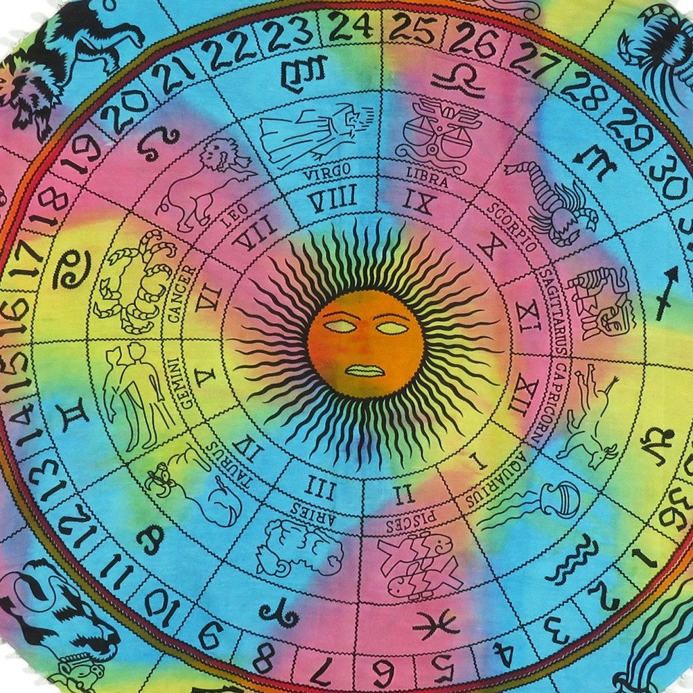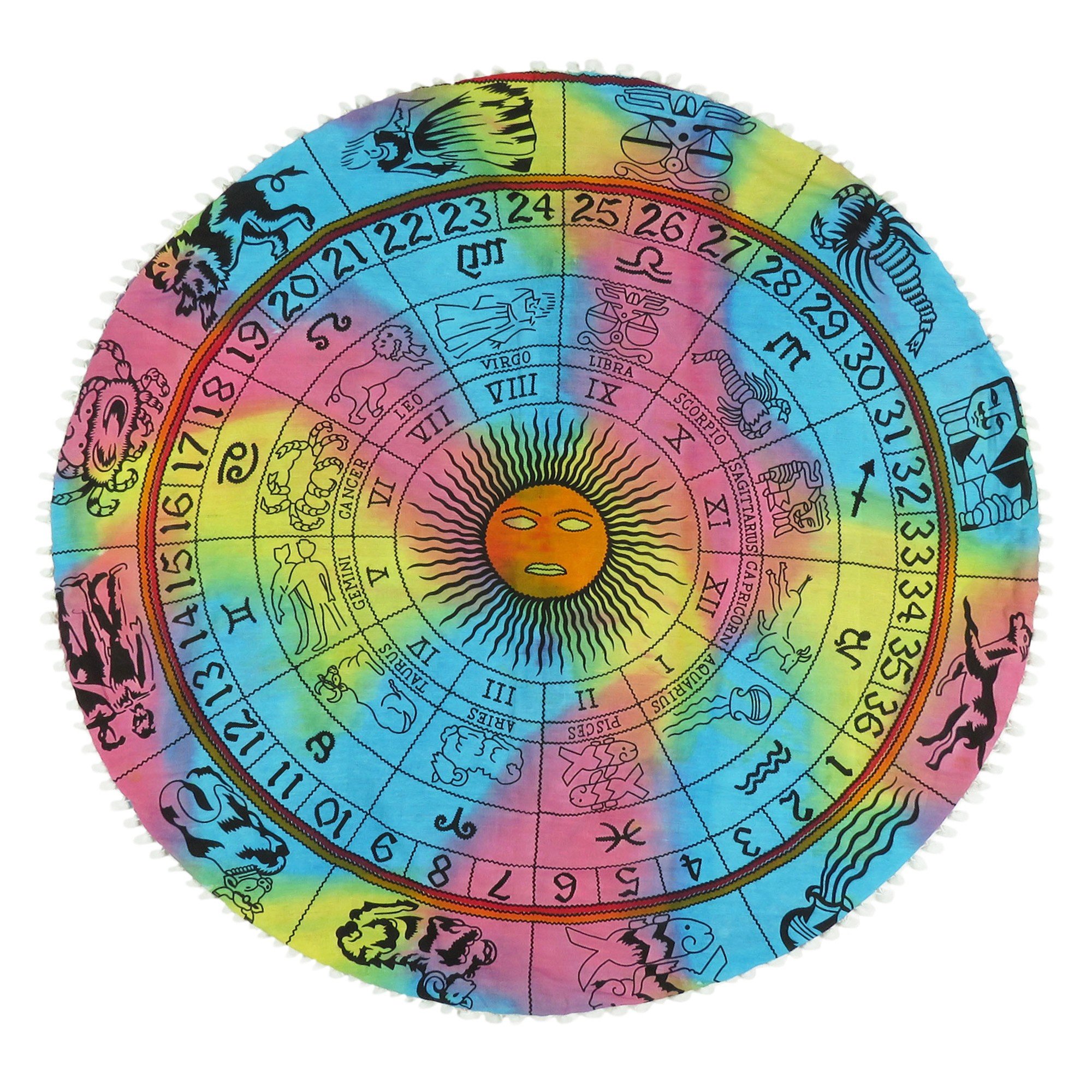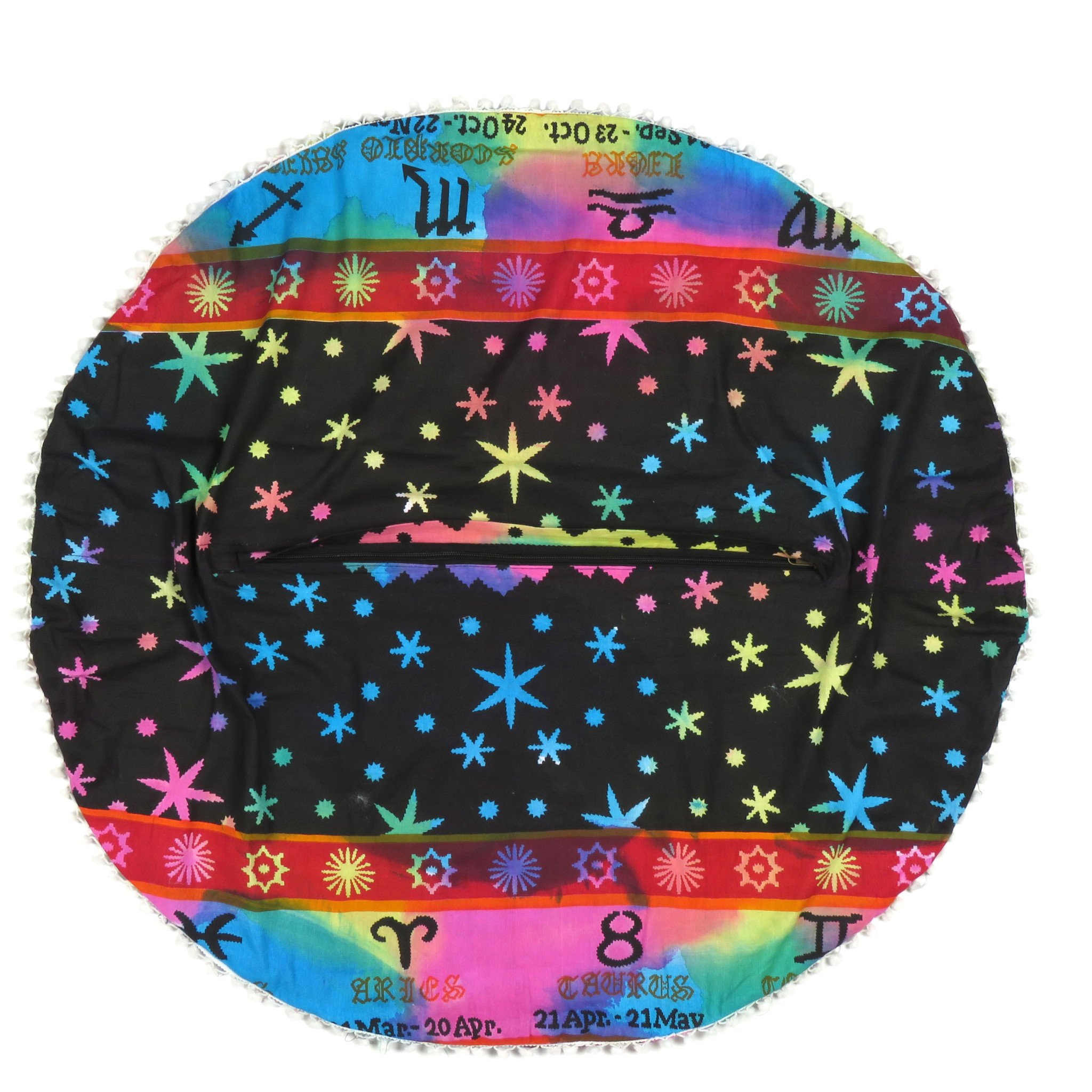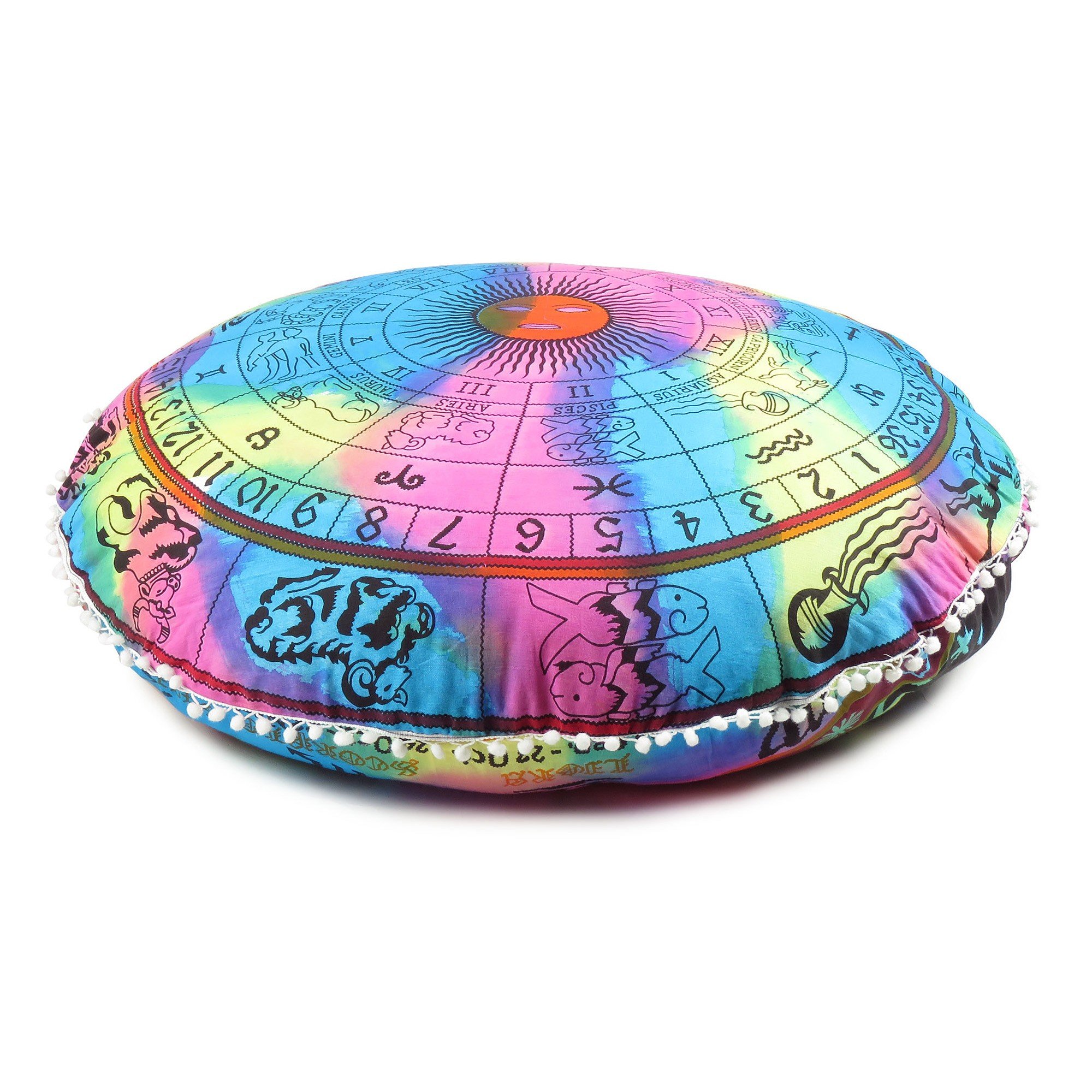Bring a bit of fashion and zip to your space with this eye-catching and comfy 32-inch x 32-inch blue and pink round horoscope fabric floor throw pillow cover with pompoms. This blue and pink colored decorative pillow cover is made from high grade polyester that is durable and long lasting. Charming decorative pom-poms give this design texture along with a hand-crafted look and feel. Decorative pillows are a great way to change up the look and feel of your space easily and quickly. A great decorative accessory to add color and dimension to your favorite chair, accent your sofa, or to use as part of your bed ensemble. 32-inch h x 32-inch w x 0.3-inch d.