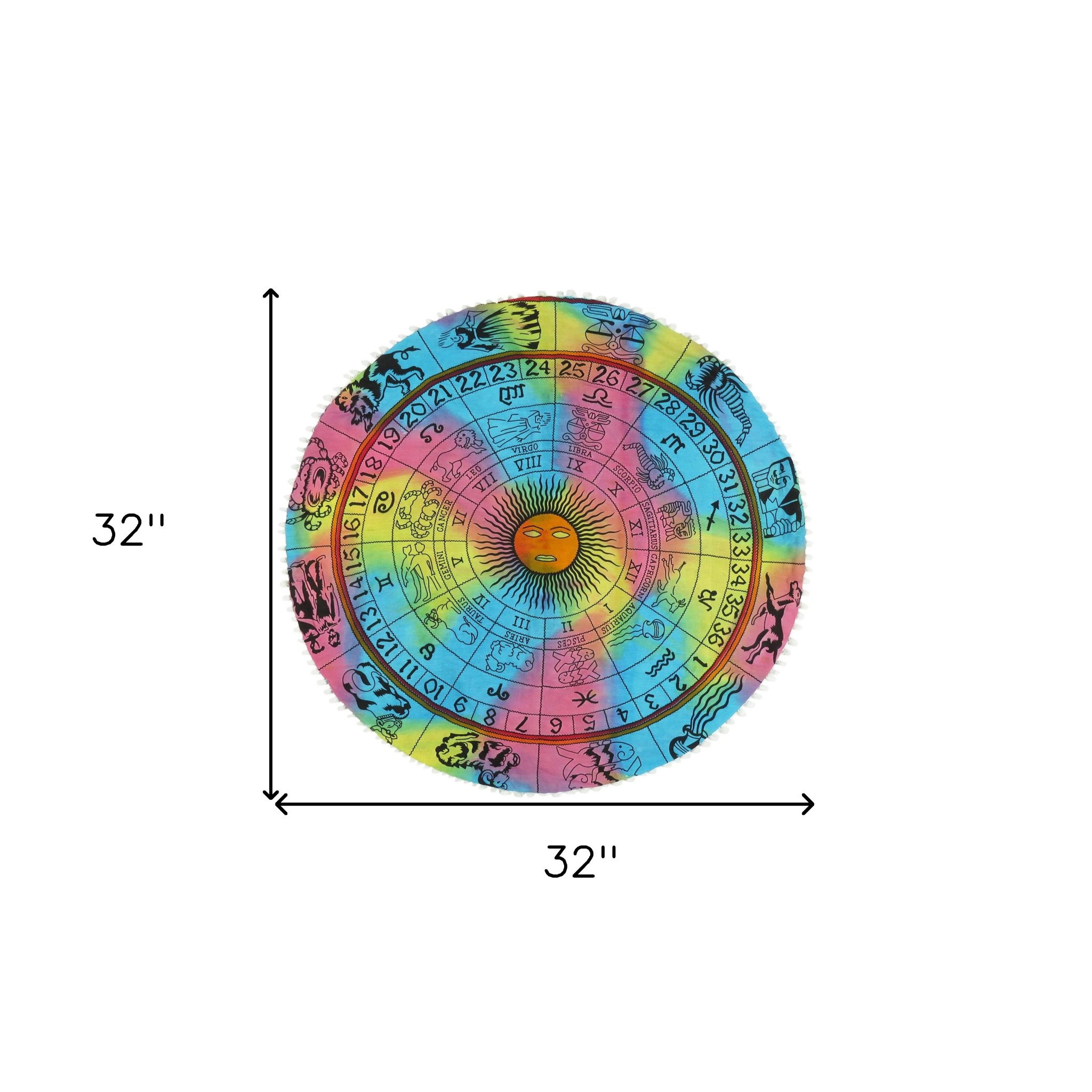 32" X 32" Blue And Pink Round Horoscope Fabric Floor Throw Pillow Cover with Pompoms