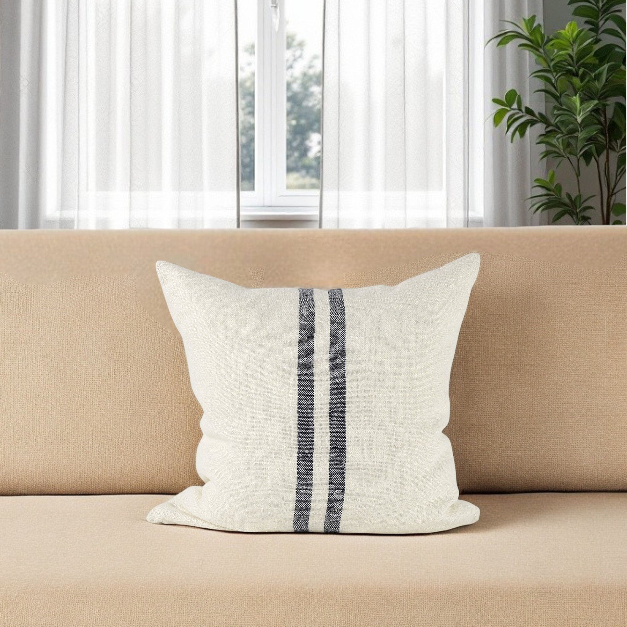 Home > 22" Beige and Blue Striped Linen Throw Pillow Cover