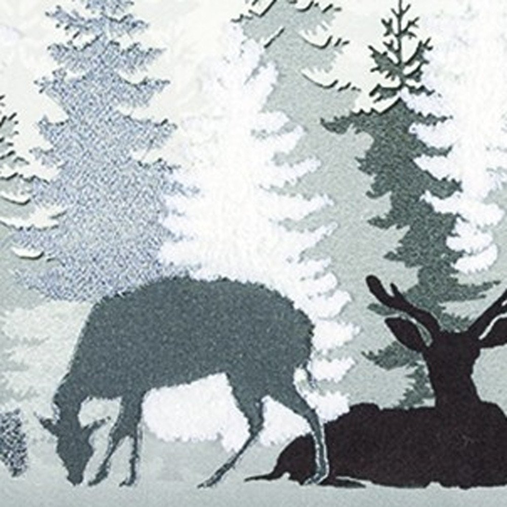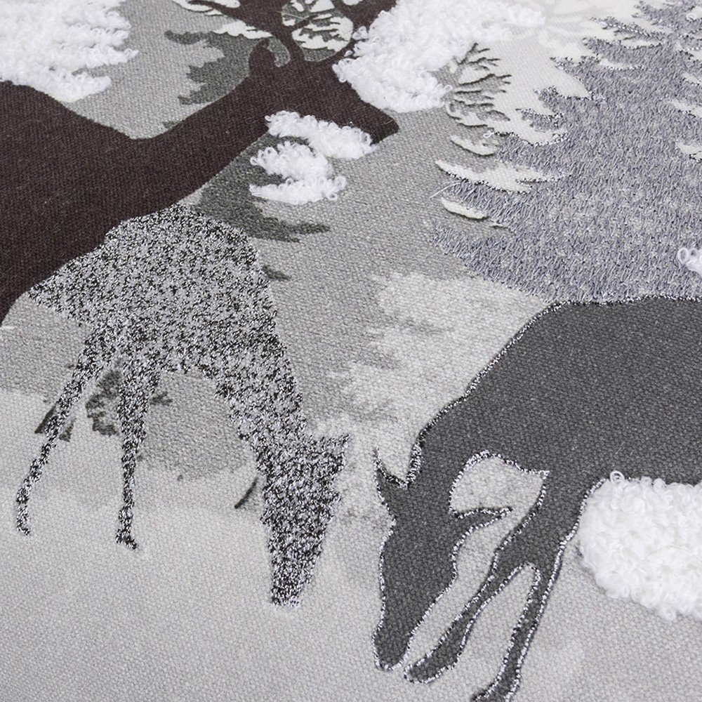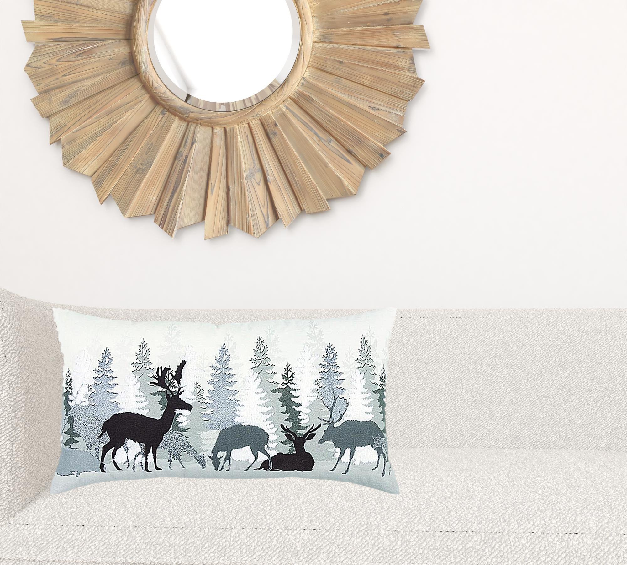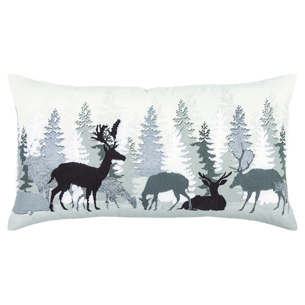 Decorate in a classy and elegant way to celebrate the holiday season with this Gray Woodland Deer Decorative Lumbar Throw Pillow. The scene is set on a winter day in the woods with dimensional and textural pinetrees in the background and grazing and lounging deer in the foreground. A mix of neutral grays, silvers, and charcoal printing and embroidery on the natural canvas background give this pillow and unique decorative edge. Beautiful and comforting, this neutral and earthy pillow is winter without specifically saying holiday and could be used most of the year. This motif would also be ideal in lodge, lake or mountain home settings. Designed for low back lumbar comfort, this rectangular 14" x 26" decorative accent features a solid back with a hidden zipper closure for convenience.