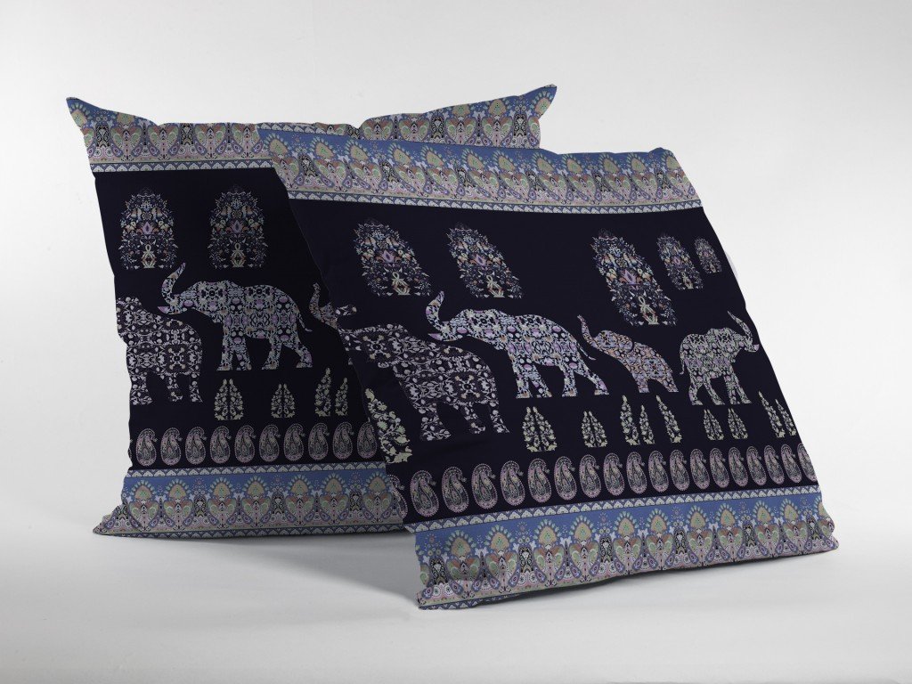 This gorgeous Purple Ornate Elephant Suede Throw Pillow represents the perfect bohemian style with a contemporary color palette. The intricately decorative elephant prints and paisley patterns in soft blue and cream tones create a stunning visual contrast over the deep purple-black background. Crafted from a sturdy suede fabric, the pillow ensures durability with a soft and smooth texture, ideal for everyday use. The soft and cushiony feel comes from the high-quality polyfill insert that adds to the fluffy look while ensuring maximum comfort for relaxation. Flaunt this ornate throw pillow in your contemporary home to emphasize a classic boho-chic aesthetic in your living room. 18” x 18” x 5”